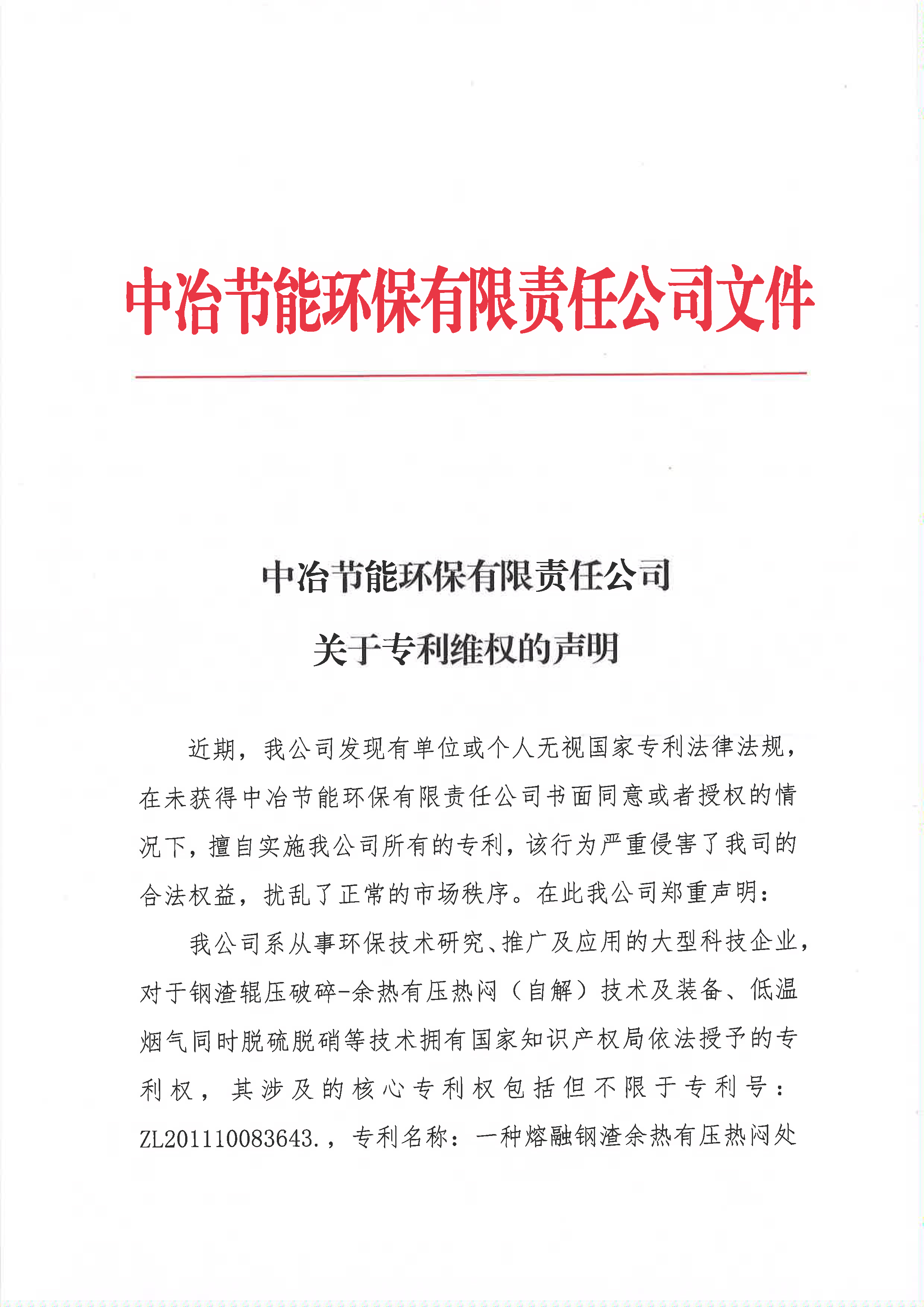 中冶節(jié)能環(huán)保有限責任公司關于專利維權的聲明